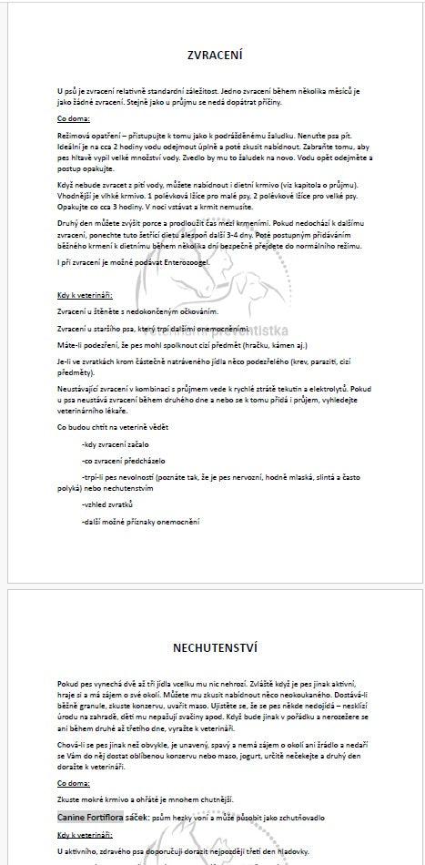 V ceně je i elektronická brožůrka s návodem, jak u psa doma zvládnout nejčastější zdravotní neduhy a kdy je čas vyrazit k veterináři. Brožůra obsahuje následující témata: Zvracení, Průjem, Nechutenství, Uši, Kožní problémy, Hot spot, Kdy veterináře neodkládat a Tabulka fyziologických hodnot.